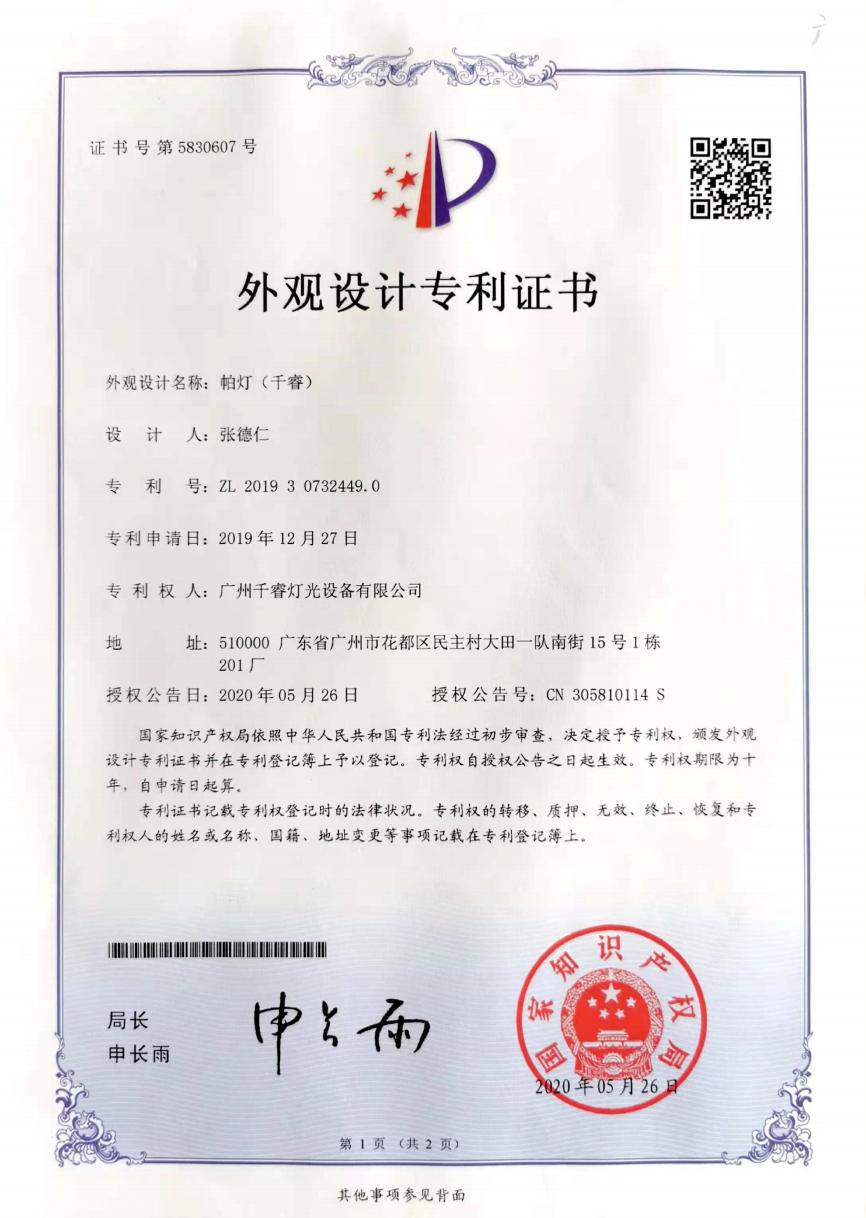Utility Model Patent Certificate – Moving Head Light