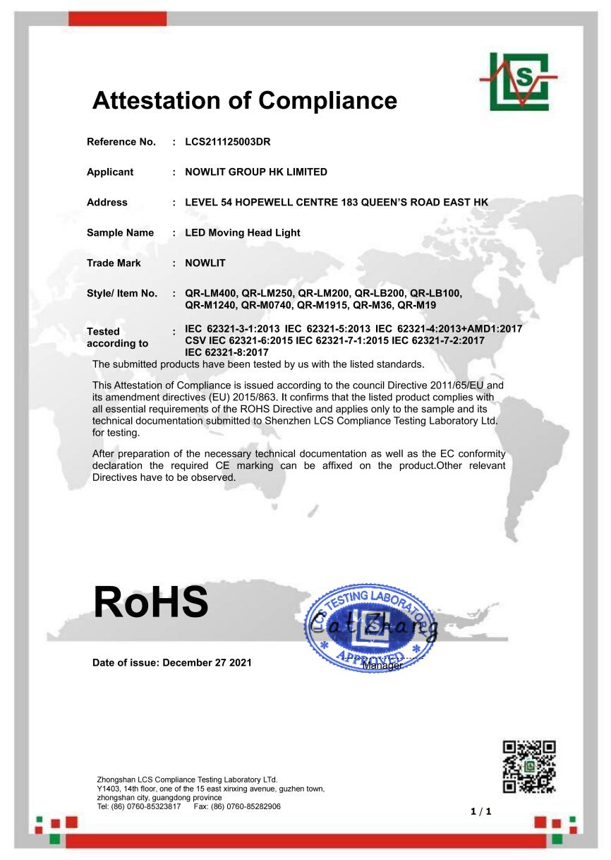 LED Moving Head Light -RoHS Certificate