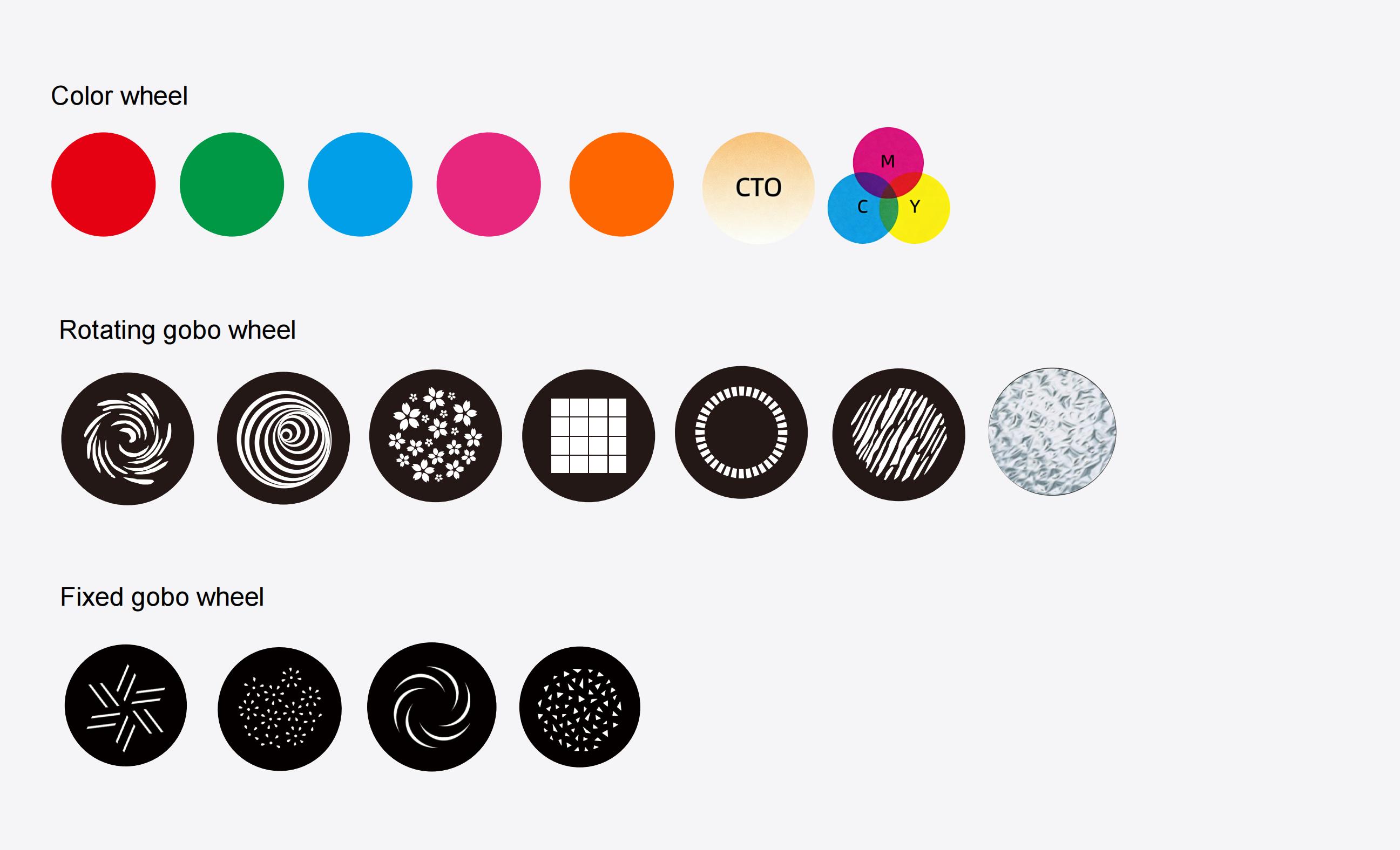 - Fixed gobo wheel: 4 fixed gobos+white, which can change speed and shake